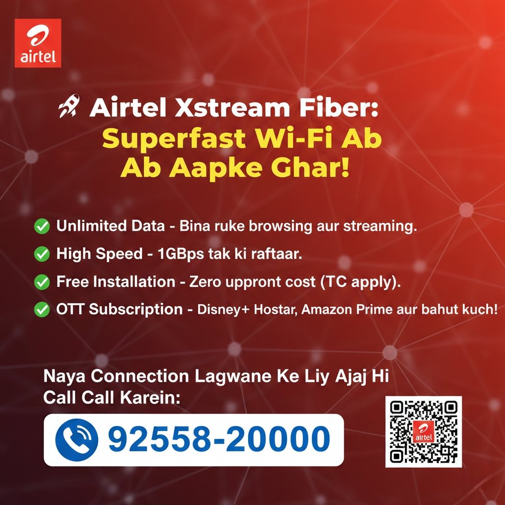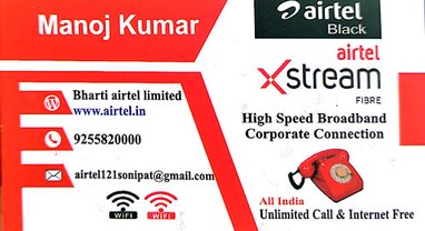 Experience seamless connectivity with Airtel WiFi Internet, Sonipat's leading Internet Service Provider. We offer high-speed broadband deals and reliable Airtel Xstream Fiber solutions for home and office. Whether you are looking for a new WiFi connection, high-speed internet providers near you, or the latest Airtel Xsafe camera security, we have you covered. Visit our Airtel store today for the best data plans and lightning-fast speeds. Your trusted partner for better services and a better connection in Sonipat!"